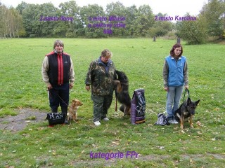 4.10.2009 - Dneska jsme se s Béďou na našem cvičáku zúčastnili podzimní klubové ligy - v kategorii stop. Zkusili jsme naši neúspěšnou zkoušku z Třince Fpr 1. Béďa odstopoval svoji průměrnou stopu, za kterou měl 80 boda a ve své kategorii si vyčuchal skvělé 3. místo (z 6 pejsanů).